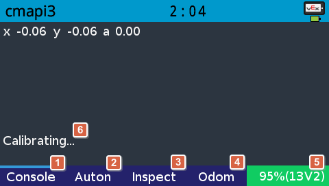 留意顯示屏上的 Inspect 頁面的訊息。確保機械人所有馬達已連接,頁面上沒有灰色標誌,以及機械人航向角度數字沒有異常以及飄移情況。所有馬達所處的位置在介面上應顯示為0。如果機械人航向角度數字發生飄移情況,可以按下 Console 頁面的 Reset 按鈕重設感應器。