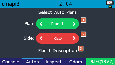 從CMAPI2遺留的分頁。使用者可以使用這個分頁選擇自動模式開始後執行哪一個自動計劃。使用者亦可以選擇紅方以及藍方,這會改變變數is_blue_side的值,讓程式在自動計劃中在不同區域的情況下執行不同的策略。以下是一個例子: