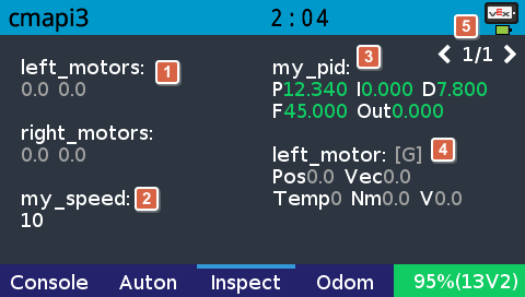 P值、I值、D值、F值、及最新輸出Out。當檢查 PROS Motor 實例,頁面會以顏色顯示設定的齒輪組類型