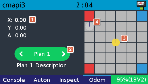 這個頁面可視化機械人在場地的位置。座標單位為CM,0點在場地的中心,地圖的上方是場地的北面。機械人在不同的自動計劃的初始位置可以在main.cpp檔案進行設定: